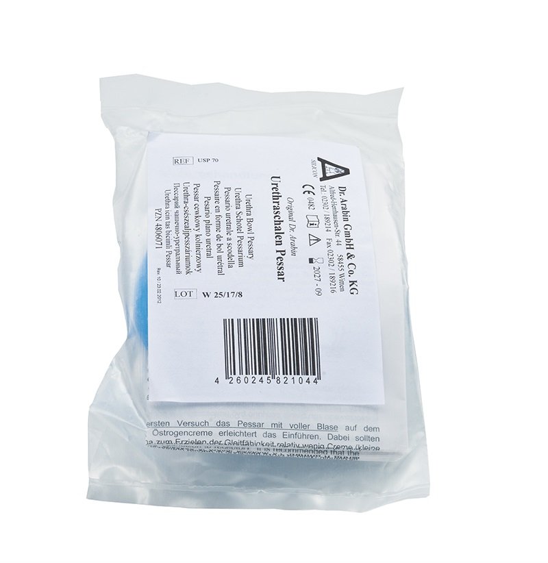 Пессарий чашечно-уретральный Dr. Arabin USP имеет форму чаши. Пессарий вводится во влагалище в согнутом виде, затем расправляется. При установке такого пессария его выступающая часть располагается в направлении лобкового сочленения, прижимает уретру и поддерживает ее «навесу», что позволяет компенсировать некоторую недостаточность сфинктера мочевого пузыря. Изделие создает опору для тазовых органов, препятствуя их дальнейшему опущению, а также выпрямляет уретру и предотвращает недержание мочи при кашле, чихании, смехе и поднятии тяжестей. За пессарием легко ухаживать — достаточно промывать его теплой водопроводной водой с мылом. Можно обрабатывать паром.Показания к применению: