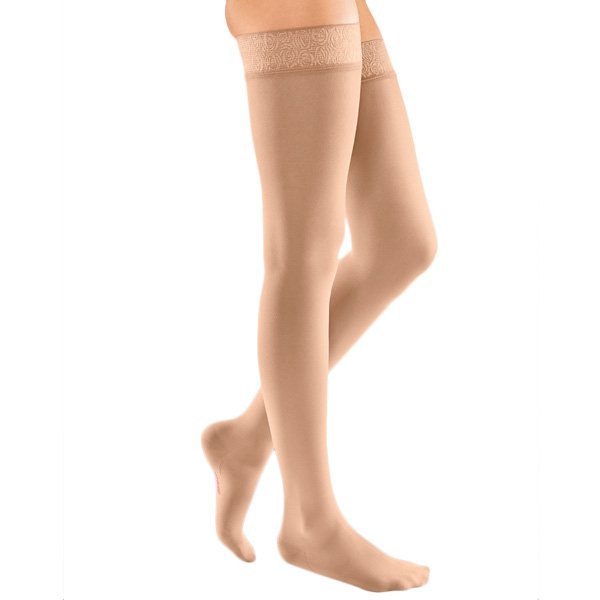 Компрессионные чулки Mediven Elegance 1903 создают градуированное давление на мягкие ткани и вены ног: 100% - в области лодыжки, 70% (от давления на лодыжке) - в верхней части голени, 40% - на бедре. За счет этого восстанавливается отток венозной крови от стоп к сердцу. С помощью такой компрессии кровообращение в ногах в течение дня идет правильно, снижаются риски развития варикоза. На деле этот компрессионный эффект вы почувствуете с первого дня носки - ваши ноги просто не устанут к вечеру даже при длительной ходьбе. В трикотаже Mediven Elegance используется технология Clima Fresh. Это специальная пряжа с ионами серебра в структуре нитей. Она обеспечивает антибактериальный и антигрибковый эффекты в носочной части. Стопы не потеют в течение дня, даже в теплую погоду. У данных чулок особо плоские швы в носочной области. Это новая технология вязки Soft Elastic. Она придает изделиям с закрытым носком дополнительную мягкость, больше свободы для пальцев ног. Технология Perfect Fit за счет эластичных нитей обеспечивает правильное распределение чулок по ноге, без образования складок. А широкая (до 5 см) силиконовая резинка не позволяет чулкам “съезжать”.Показания к применению: