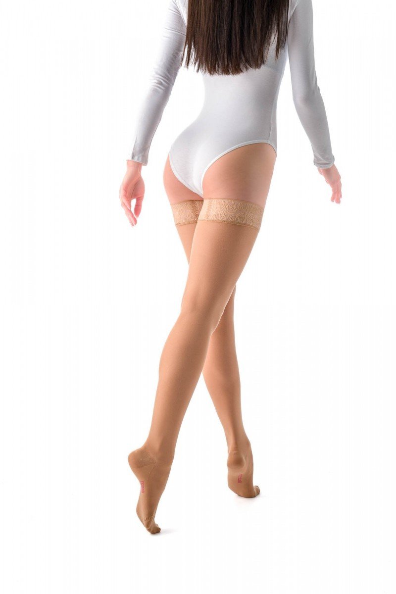 Компрессионные чулки Mediven Elegance 190 удивят вас не только лечебным эффектом, но и внешним видом. Именно линейка трикотажа Elegance поражает эстетикой, цветами и фактурой, которую никак не ожидаешь от лечебного компрессионного трикотажа. Нежная, полупрозрачная ткань обладает удивительной прочностью.Компрессионные чулки Mediven Elegance 190 имеют 1 класс компрессии (18-21 мм рт. ст.) и закрытый носок. Они визуально не отличаются от привычных чулок, но при этом отлично справляются с “синдромом усталых ног”, служат для профилактики варикоза и лечения сосудистых сеточек. Эта модель с “малой” длиной. То есть рассчитана на комфортную носку при нестандартной длине ног (например, невысокий рост, непропорциональное соотношение длины тела и ног и пр.).