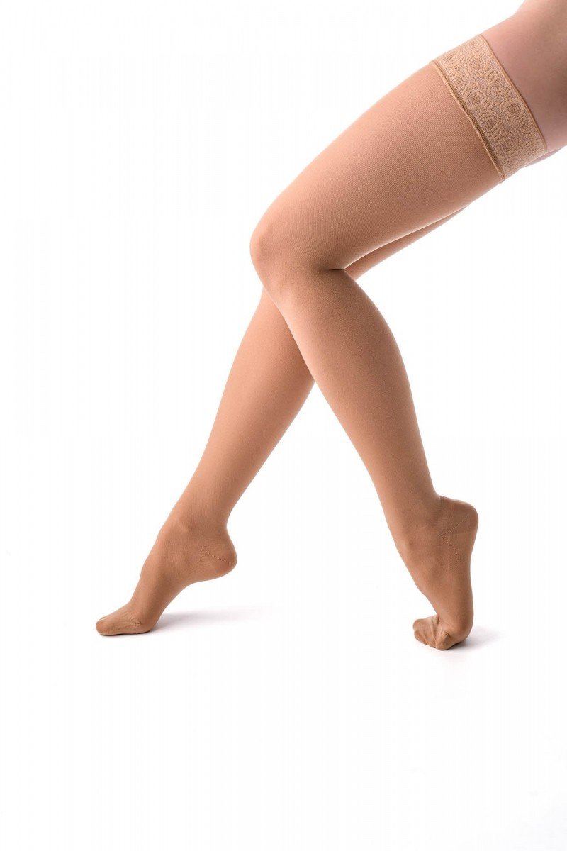 Компрессионные чулки Mediven Elegance 1903 создают градуированное давление на мягкие ткани и вены ног: 100% - в области лодыжки, 70% (от давления на лодыжке) - в верхней части голени, 40% - на бедре. За счет этого восстанавливается отток венозной крови от стоп к сердцу. С помощью такой компрессии кровообращение в ногах в течение дня идет правильно, снижаются риски развития варикоза. На деле этот компрессионный эффект вы почувствуете с первого дня носки - ваши ноги просто не устанут к вечеру даже при длительной ходьбе. В трикотаже Mediven Elegance используется технология Clima Fresh. Это специальная пряжа с ионами серебра в структуре нитей. Она обеспечивает антибактериальный и антигрибковый эффекты в носочной части. Стопы не потеют в течение дня, даже в теплую погоду. У данных чулок особо плоские швы в носочной области. Это новая технология вязки Soft Elastic. Она придает изделиям с закрытым носком дополнительную мягкость, больше свободы для пальцев ног. Технология Perfect Fit за счет эластичных нитей обеспечивает правильное распределение чулок по ноге, без образования складок. А широкая (до 5 см) силиконовая резинка не позволяет чулкам “съезжать”.Показания к применению: