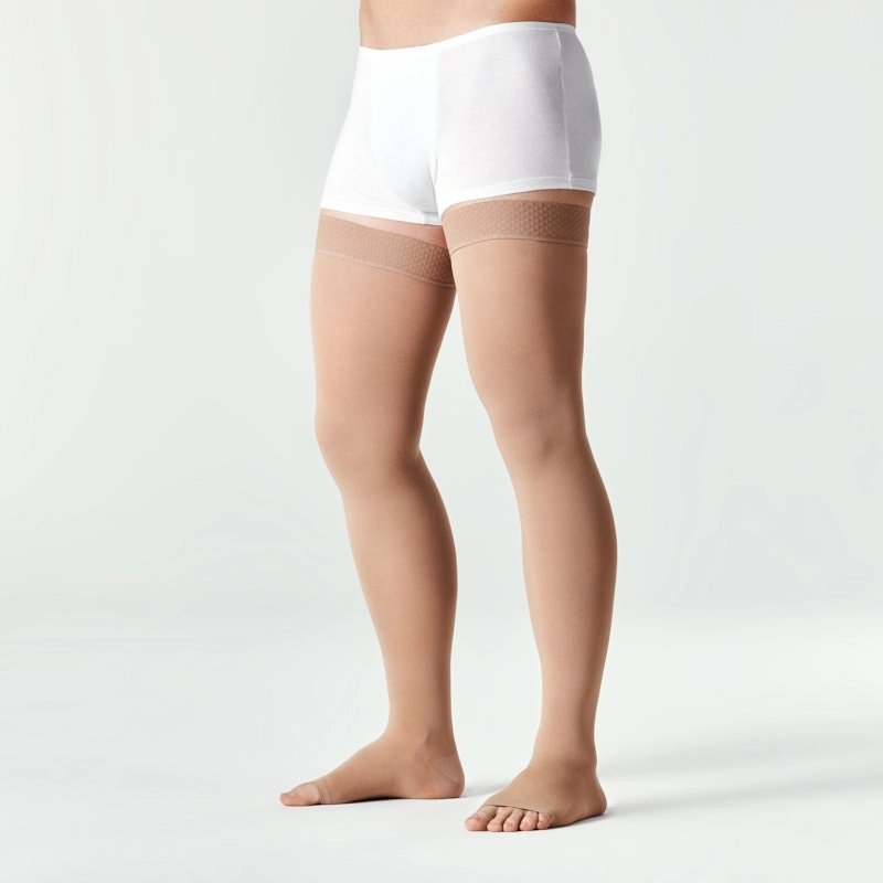 - Эластичная резинка с капельными силиконом надёжно фиксирует изделие на бедре.