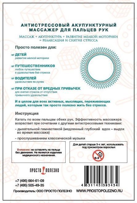 Кольцо-биомассажер от Просто полезно — уникальное средство для релаксации и оздоровления. Благодаря своей особой форме и материалам, оно обеспечивает мягкий массаж активных точек на ладонях и стопах, способствуя расслаблению и снижению уровня стресса. Использование кольца-антистресс су-джок улучшает кровообращение, повышает иммунитет, снимает мышечное напряжение и усталость, а также нормализует работу нервной системы. Это идеальное решение для тех, кто хочет сохранить свое здоровье и эмоциональное равновесие.Показание к применению:
