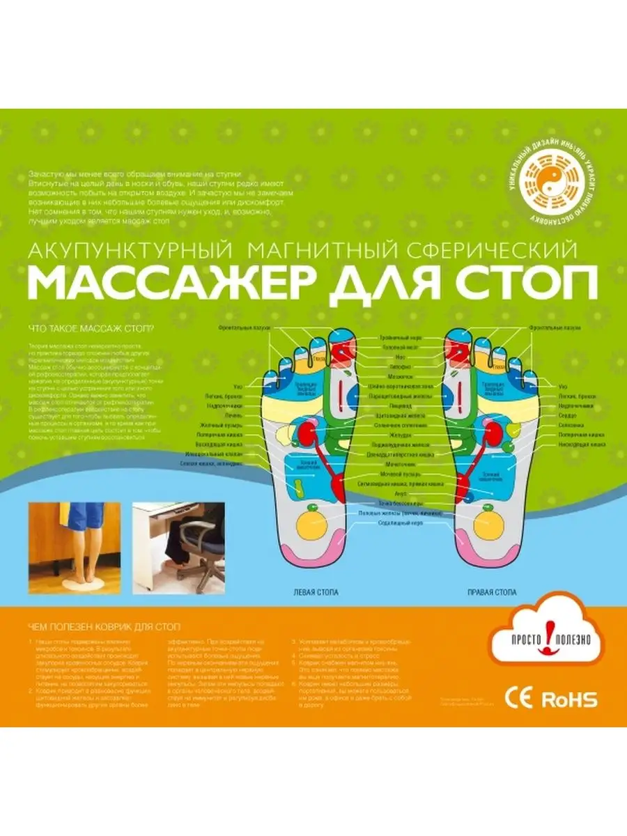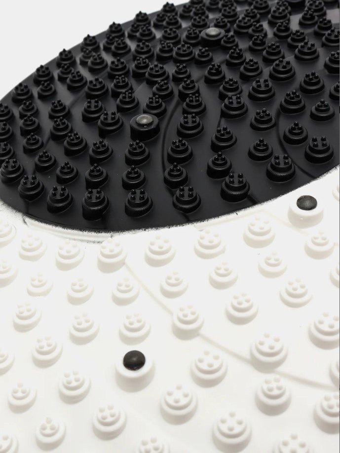 Магнитный массажер для ступней работает за счет стимуляции акупунктурных точек. На наших стопах расположено множество чувствительных зон, связанных с внутренними органами. Массаж позволяет дозировано воздействовать на проблемные части тела. Магнитные вставки создают эффект магнитотерапии, положительно влияя на суставы. Массажер для стоп улучшает общий тонус, снимает усталость, уменьшает отеки, улучшает кровообращение и даже укрепляет иммунитет. Уйма пользы всего за несколько минут в день. А лаконичный дизайн коврика в стиле “Инь и Янь” впишется в любой интерьер.