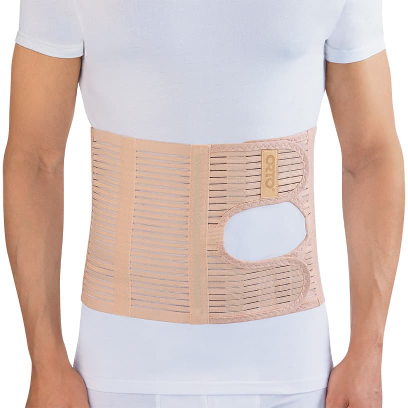 Бандаж используют после операции в период реабилитации. Изделие обеспечивает лёгкую фиксацию и поддержку передней брюшной стенки, а также фиксирует калоприёник/дренжные приспособления, препятствуя их смещению. Изделие изготовлено из эластичного материала, фиксируется с помощью застежек Велкро. Для большего комфорта в конструкции предусмотрены гибкие ребра жесткости, которые предотвращают скручивание. Центральная часть бандажа снабжена шестью карманами для размещения в них четырех моделируемых ребер жесткости. В комплекте съемный карман для калоприёмника, который фиксируется к основе с помощью застежки «Велкро». Использование бандажа снижает риск возникновения грыжи в области послеоперационного рубца и предотвращает опущение внутренних органов. Бандаж оказывает компрессионное воздействие, что улучшает кровообращение, способствует скорейшему заживлению рубца, снижает болевые ощущения, улучшает общее самочувствие.Показания к применению: