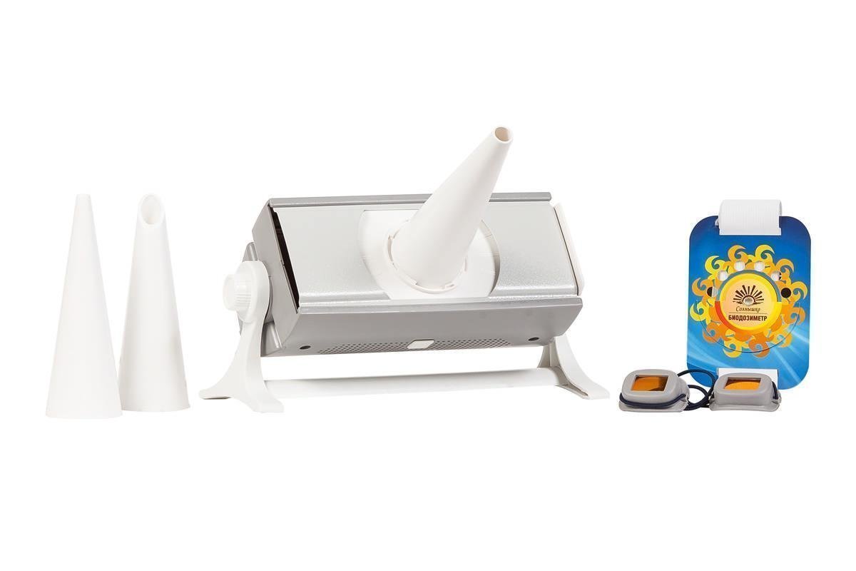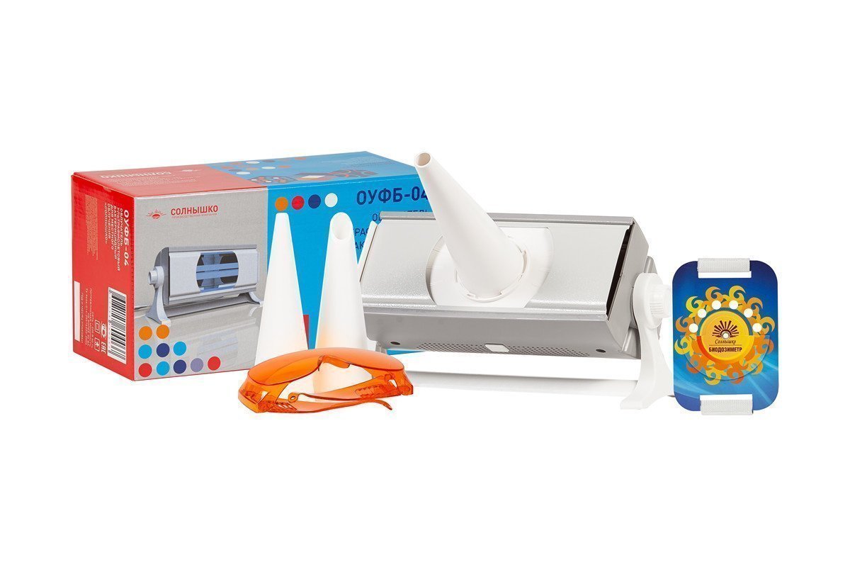 Облучатель «Солнышко ОУФб-04» предназначен для общей, местной и внутриполостной обработки ультрафиолетом. Обработка происходит в спектральном диапазоне излучения 180–275 нм (УФ-С-диапазон). Ультрафиолетовое облучение помогает нормализовать иммунный статус, обладает антибактериальным действием, улучшает восстановительные процессы и нормализует обмен веществ. В комплект с облучателем входят: защитные очки, насадка с выходным отверстием 5 мм, насадка с выходным отверстием 15 мм, насадка с выходным отверстием под углом 60 градусов, биодозиметр. Прибор готов к работе через 1 минуту после зажигания УФ-лампы. Облучатель может работать в течение 8 часов в сутки в таком режиме: 30 минут работы и 15 минут перерыва.Показания к применению: