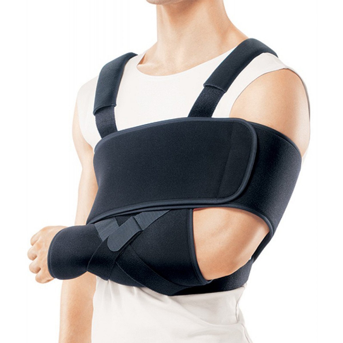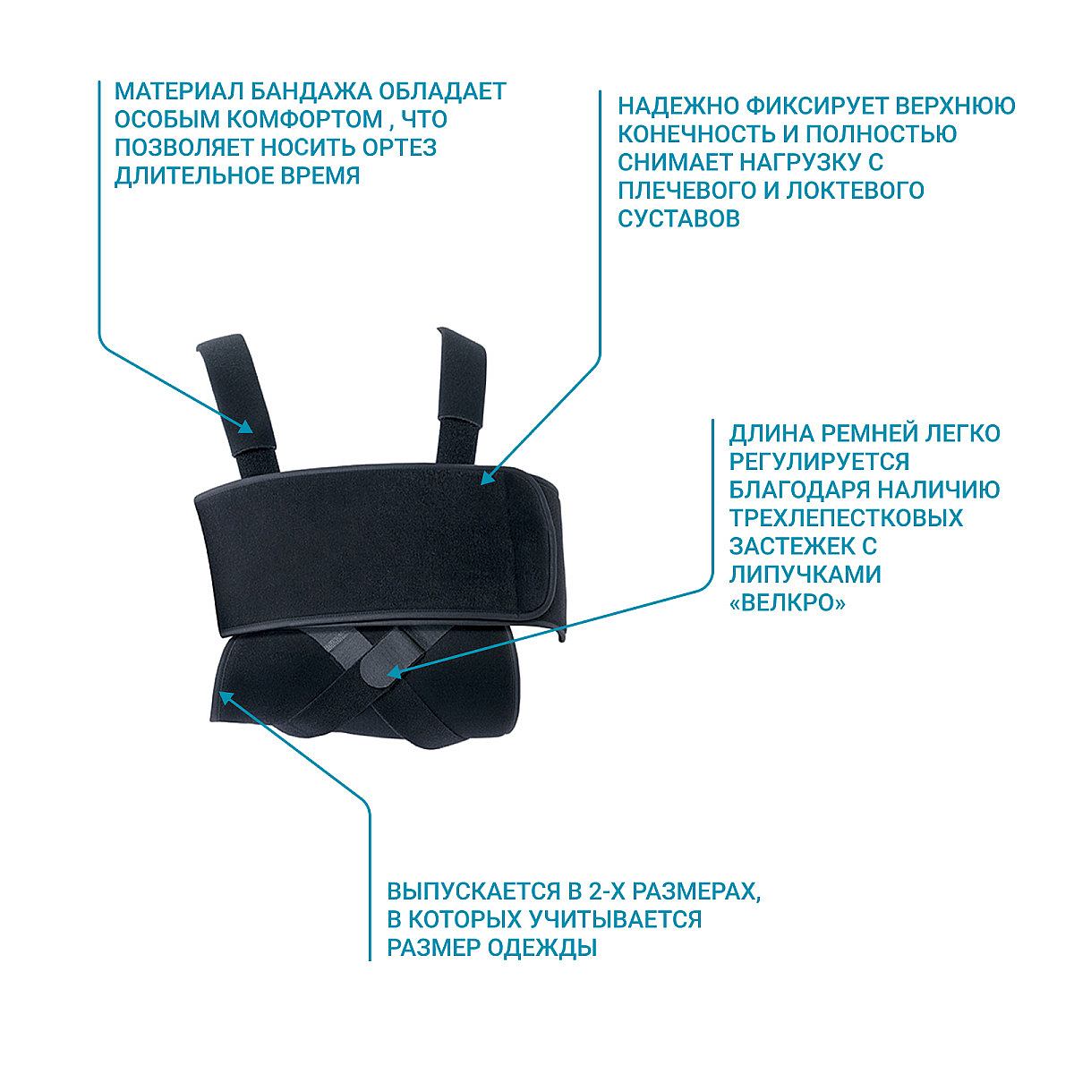 - Надежно фиксирует верхнюю конечность и полностью снимает нагрузку с плечевого и локтевого суставов;