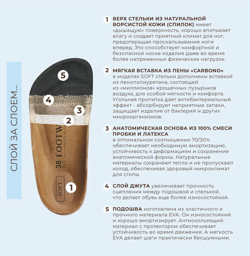 Сабо выполнены из войлока. Анатомическая форма позволяет стельке плотно прилегать в стопе, снижая и равномерно распределяя ударную нагрузку на стопу. Валик под пальцы защищает от давления, трения, образования потертостей. Бортики и углубление под пятку помогают стабилизировать стопу. Стелька дополнена мягкой вставкой "carbono", которая дарит мягкость и особый комфорт.Показания к применению: