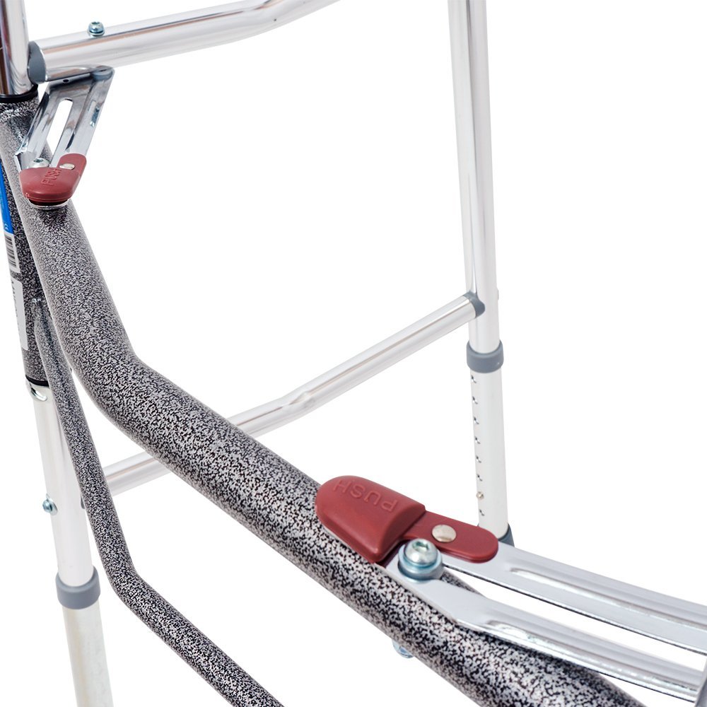- Регулируемая высота. Вы сможете настроить ходунки под себя. Телескопические ножки регулируются с шагом в 2,5 см. Ходунки подойдут на рост от 160 до 180 см.